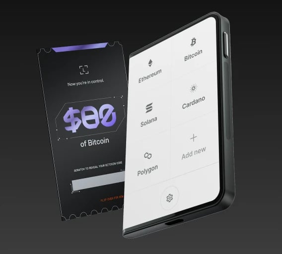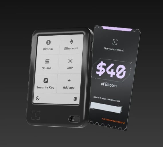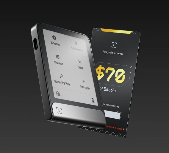 Cuando llegue tu signer, encontrarás el voucher cripto dentro de la caja. Escanea el código QR para obtener instrucciones de canje detalladas.