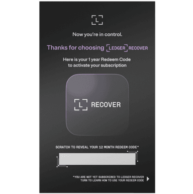 Ledger Recover availability depends on the country/region where your identity document is issued. Visit here for country/region availability. Subscription requires a valid passport or national identity card. Valid driver's licenses also accepted for Canadian and US users. Subscriptions are non-refundable except where statutory refund/cancellation rights apply. Redeem codes are valid for 1 year from purchase date. Subscriptions operate on an automatic renewal basis. Please note that while the redeem code purchase is charged in your local currency, any monthly renewal payment will be processed in EUR (Euros). Due to fluctuating exchange rates, the price in your local currency may vary at the time of each payment and you may incur additional fees from your bank for currency conversion. Cancel anytime to prevent future charges. By clicking ”Add to cart”, you agree to accept these terms and the Ledger Recover Redeem Code T&Cs here.