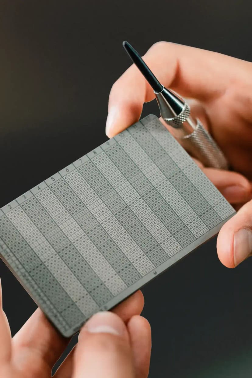 将字母[或单词]冲压到 Cryptotag 金属板上。